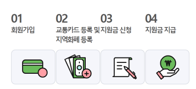 회원가입 - 교통카드 등록 및 지역화폐 등록 - 지원금 신청 - 지원금 지급