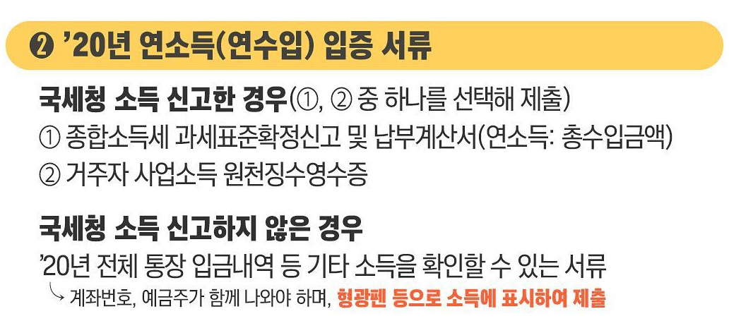 2020년 전체 통장 입금내역 등 기타 소득을 확일할 수 있는 서류가 필요합니다.