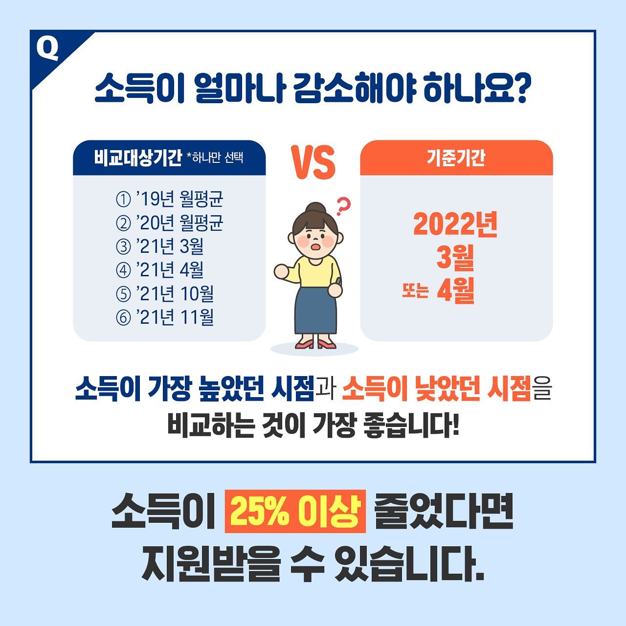 비교대상기간과 기준 기간을 비교했을 때 소득이 25%이상 줄었다면 지원받을 수 있습니다.