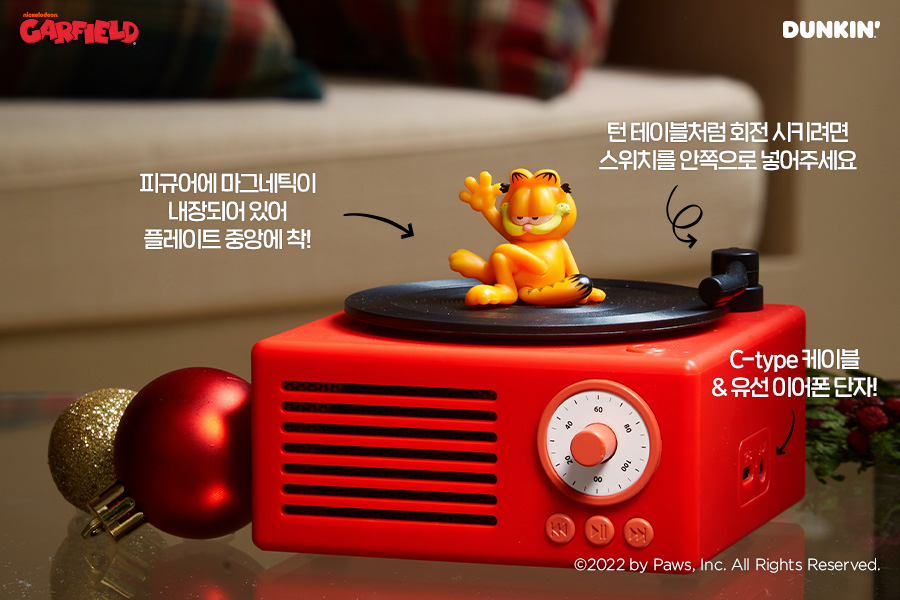 디자인 자체가 너무 예뻐서 장식품으로도 좋을 것 같은 던킨의 가필드 블루투스 스피커는 턴테이블 모양으로 디자인이 되어 있어요.