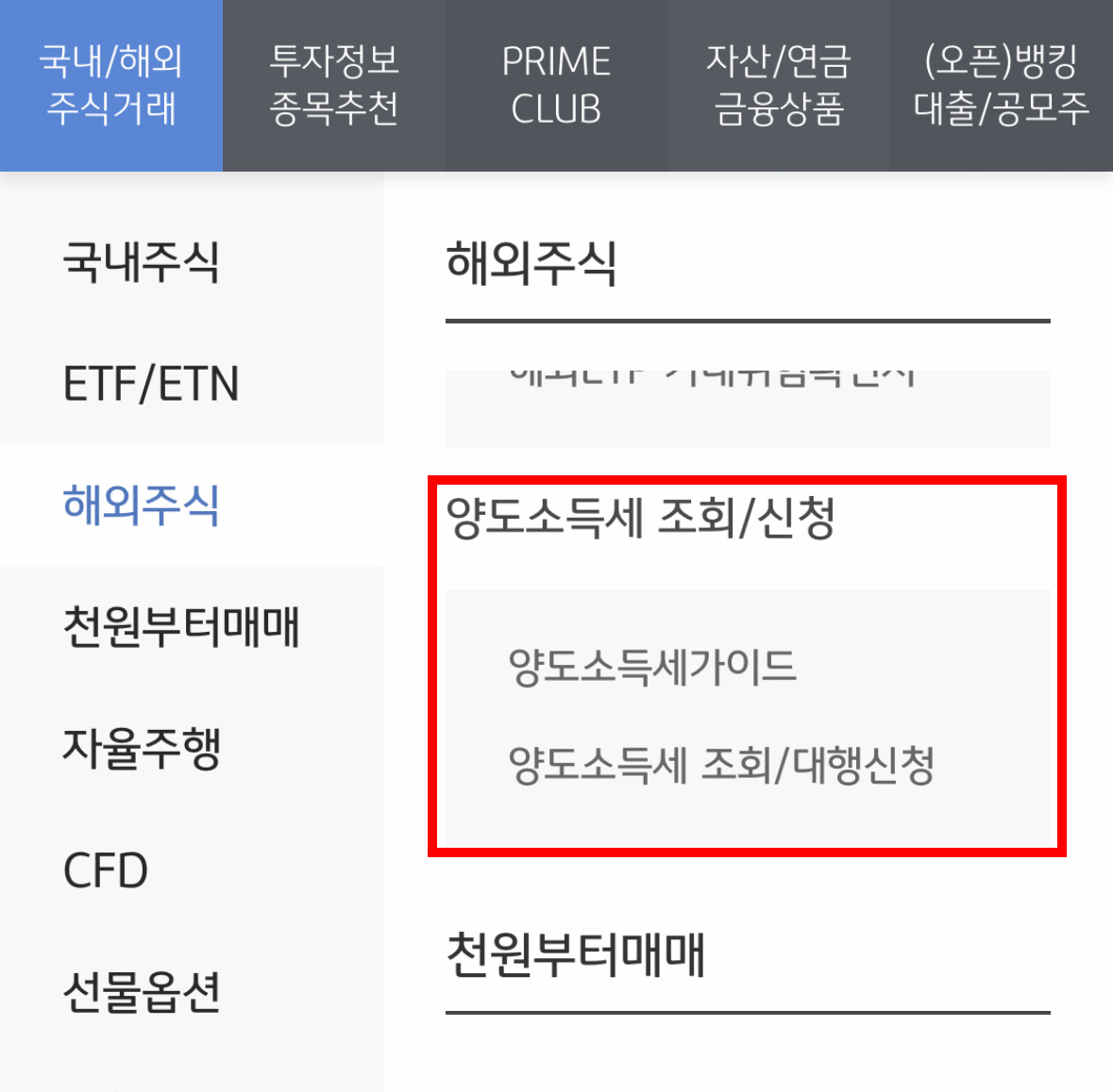 ■ 국내/해외 주식거래 > 해외주식 >양도소득세 조회/신청 메뉴가 있습니다.
