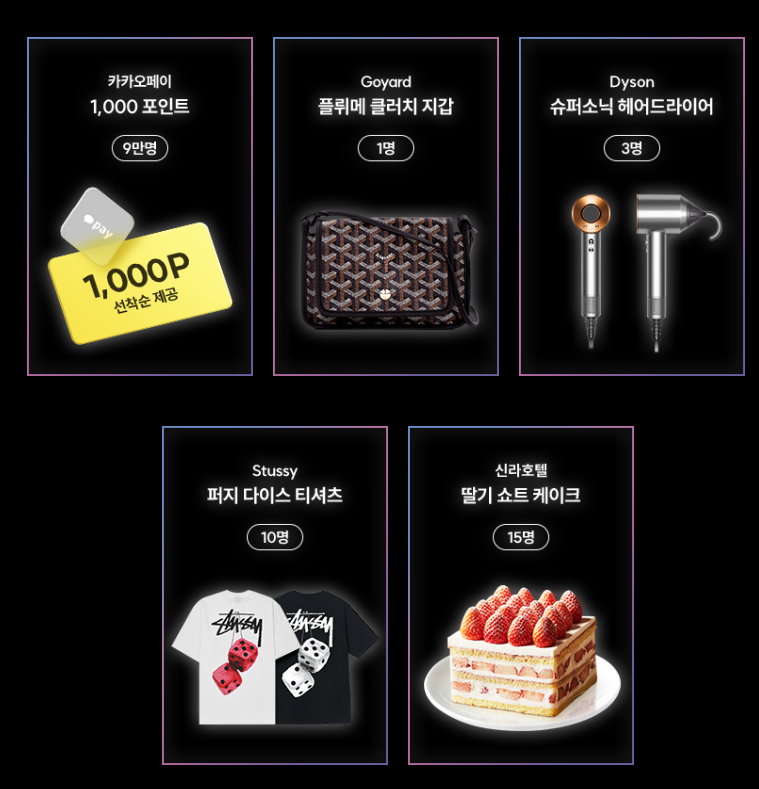 그리고 추첨을 통해 플뤼메 클러치 지갑, 슈퍼소닉 헤어드라이어, 퍼지 다이스 티셔츠, 케이크 등 지급합니다.