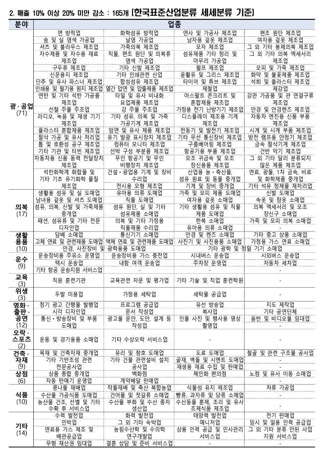 (매출 감소율이 10% 이상 업종이며, 매출액이 감소)