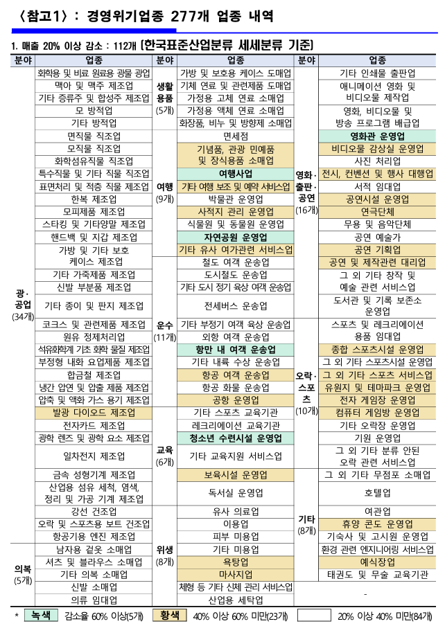 경영위기업종 소상공인 277개 업종