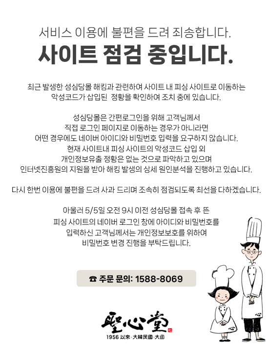 성심당 쇼핑몰도 성심당몰 앱과 마찬가지로 원래는 주문이 가능했지만 해킹으로 쇼핑몰이 중단된 상태입니다.
