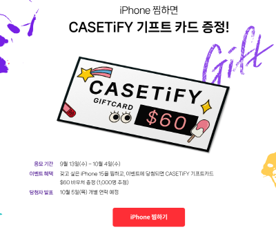 KT 홈페이지에서 아이폰을 찜하면 1000명을 추첨해서 CASETiFY 기프트 카드 60$바우처를 증정합니다.