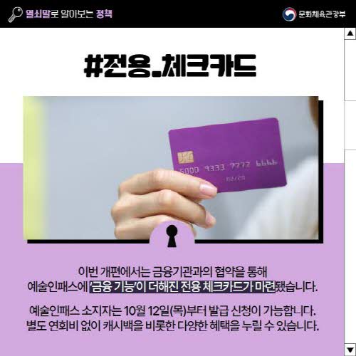 이번 개편에서는 금융기관과의 협약을 통해 예술인패스에 '금융 기능'을 더한 전용 체크카드가 도입됩니다.