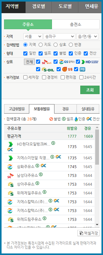 주유소(충전소) 가격 및 위치 정보 확인 가능합니다