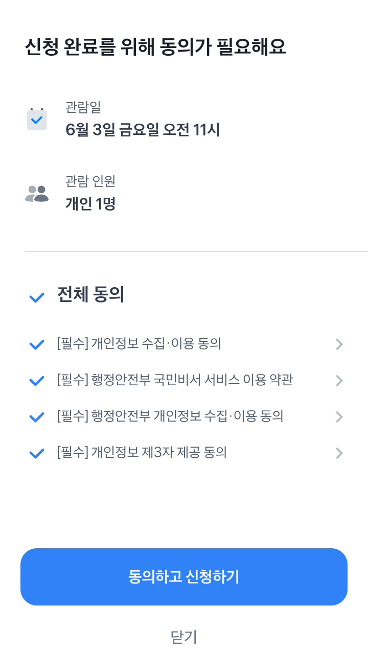내용을 확인한 후 [동의하고 신청하기] 버튼을 누르면 신청이 됩니다.