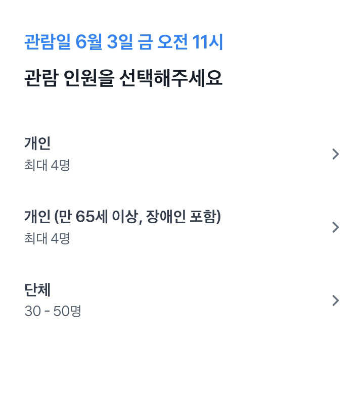 인원과 개인, 만 65세 이상, 장애인 포함, 단체 중에 선택을 해 주세요