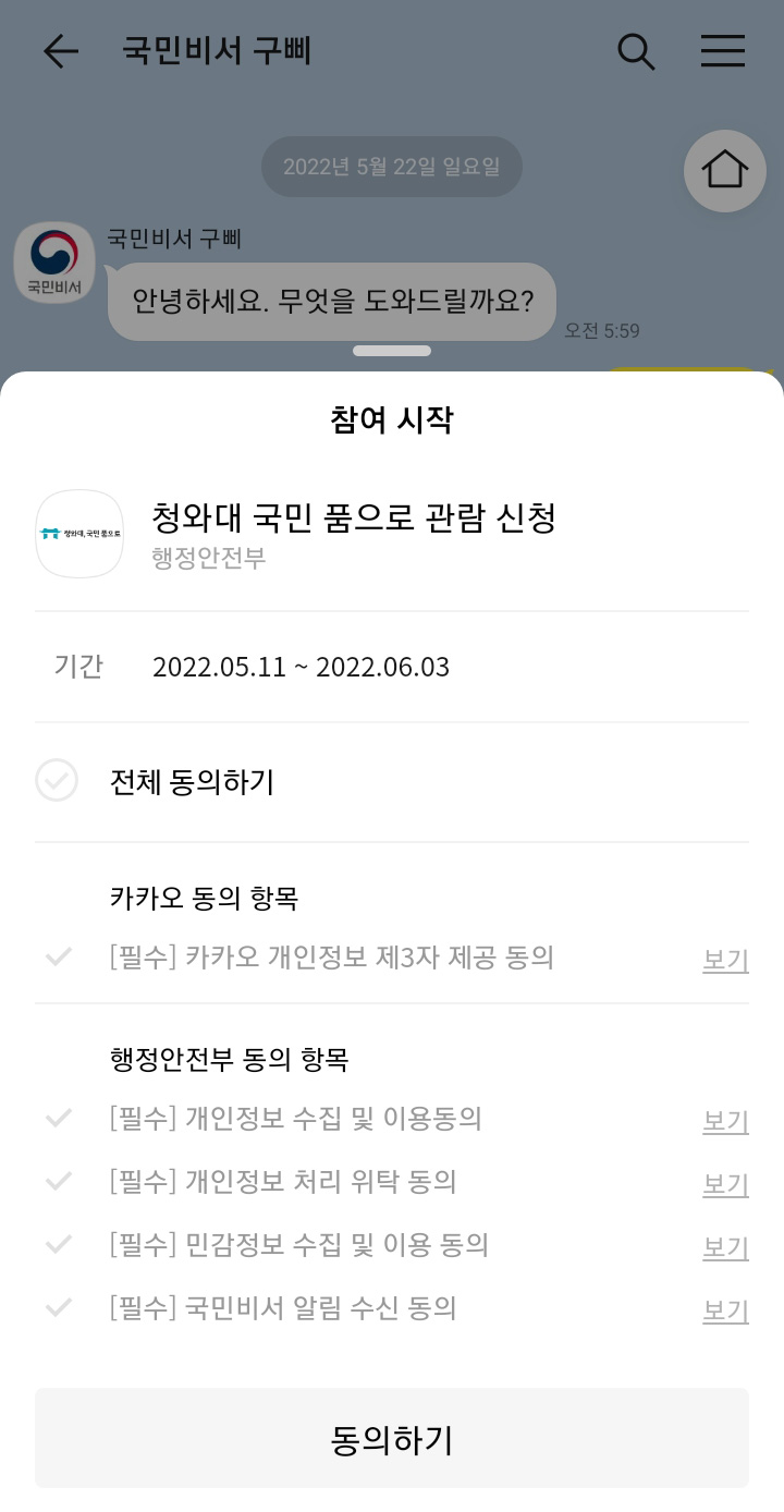 카카오톡에서는 국민비서 구삐에서 신청을 하셔야 합니다.