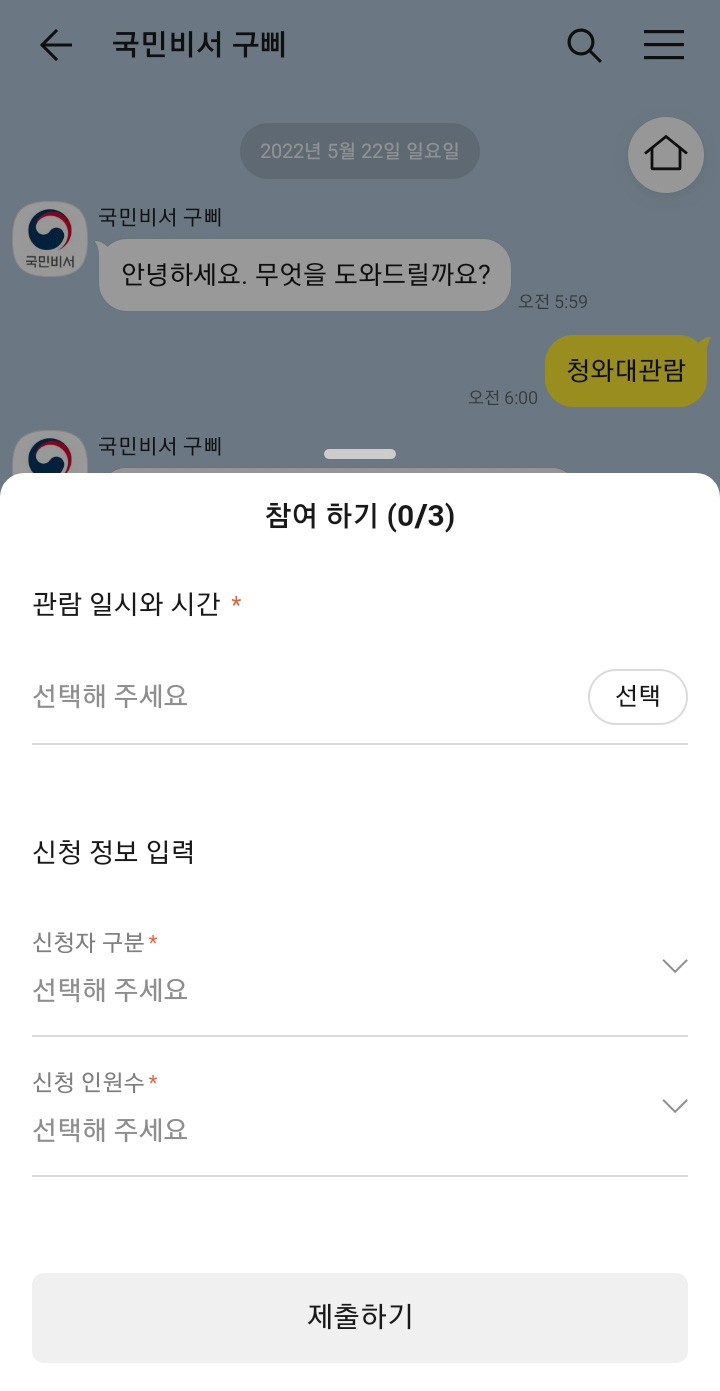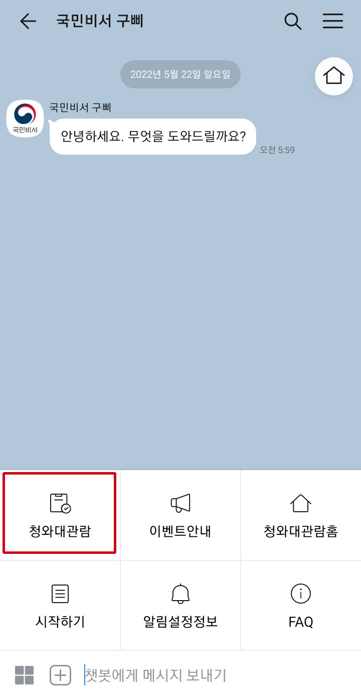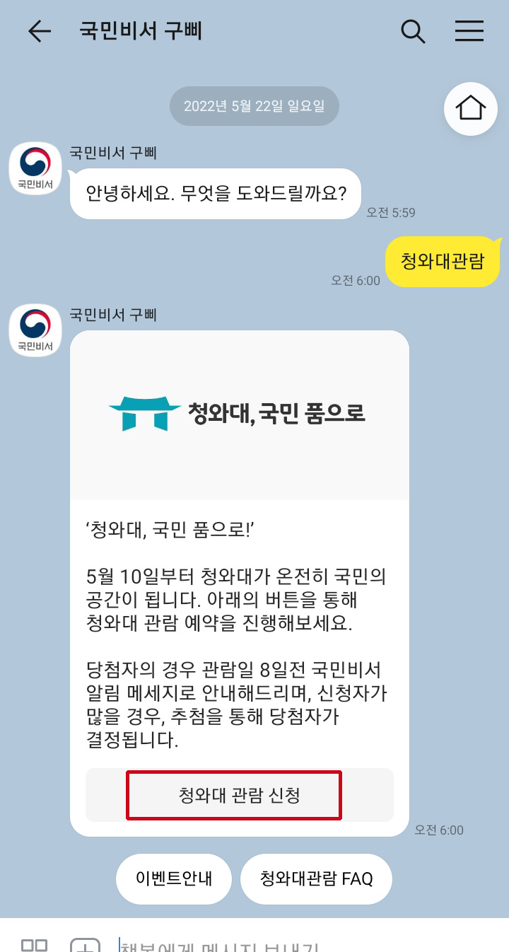 국민비서 구삐에 들어가면 하단에 [청와대관람] 버튼이 있습니다. 클릭해 주세요.