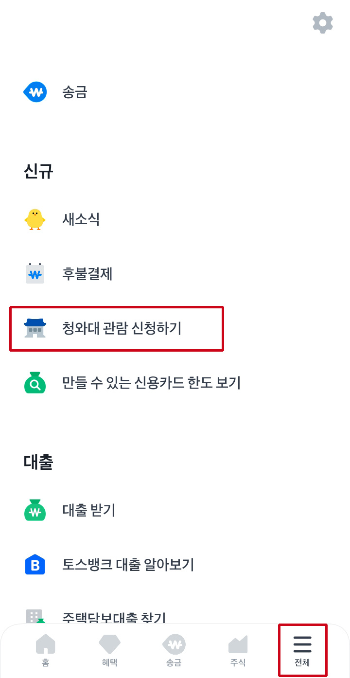 토스는 하단 메뉴 중 [전체] 버튼을 누르면 신규에 [청와대 관람 신청하기]라는 버튼이 있습니다.
