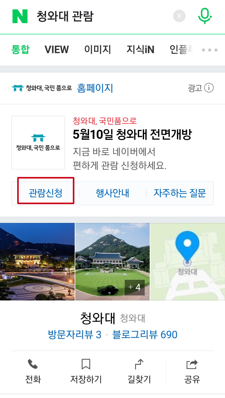 검색에서 '청와대 관람'을 검색하시면 페이지가 뜨는데 [관람 신청] 메뉴를 눌러주세요.