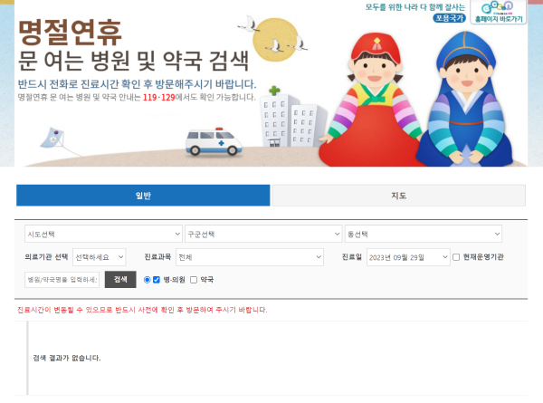 119에서도 명절연휴 문 여는 병원 및 약국 안내를 받으실 수 있습니다.