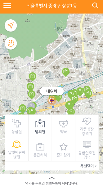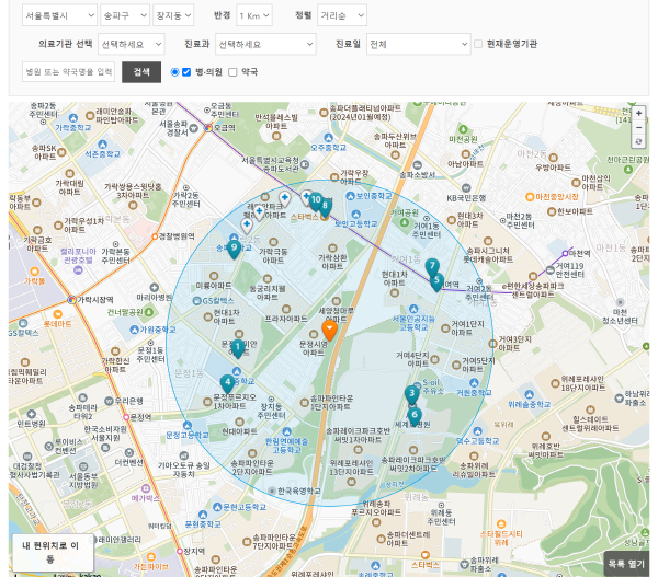 지도 텝을 누르면 자신의 위치를 설정해서 반경을 1km나 3km를 선택하면 지도에 근처의 병원이나 약국을 보실 수 있습니다.