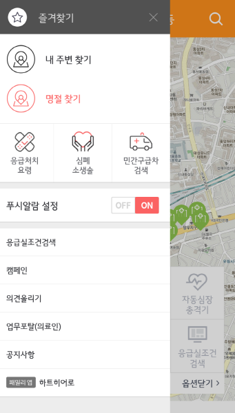 중앙응급의료센터에서 관리하는 실시간 응급실 병상정보 및 응급의료기관 정보, 관할 119연결, 자동심장충격기(자동제세동기, AED), 증상별 응급처치 요령, 독극물의 특성 및 처치요령 등이 이미지, 문자 형태로 제공됩니다.