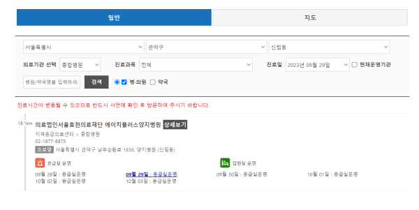 일반 검색에는 시와 구, 동, 의료기관 종류 등을 선택해서 검색할 수 있습니다.