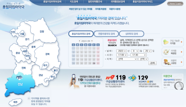 휴일지킴이약국 홈페이지 (www.pharm114.or.kr/)