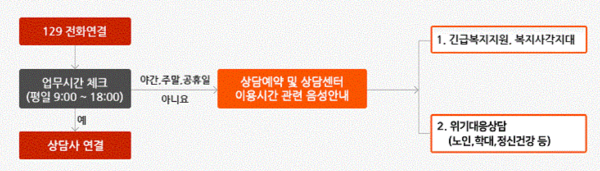 업무시간(평일 오전9시~오후6시)에는 ARS* (긴급복지, 보건의료, 사회복지, 인구아동, 노인장애인, 위기대응) 해당 업무의 번호를 눌러 상담사와 바로 연결되어 상담이 가능하며, 긴급복지지원, 복지사각지대, 학대, 정신건강 등 으로 상담을 원하실 경우 ARS 번호를 눌러 전문 상담사와 연결할 수 있습니다.
