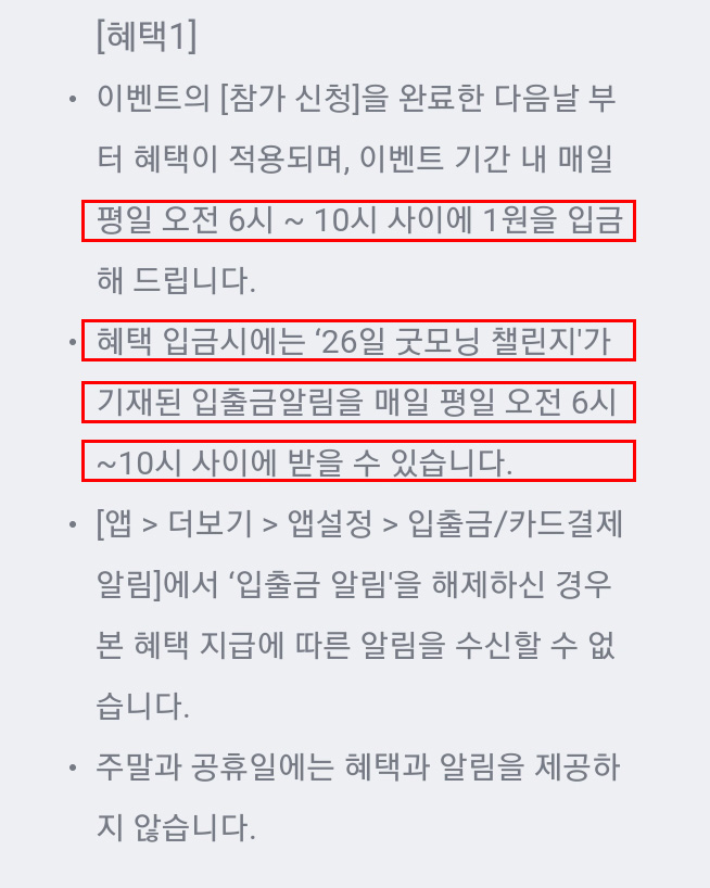 그리고 로그인을 할 때 '26일 굿모닝 챌린지'가 기재되어 입출금 알림을 받을 수 있다고 하네요.