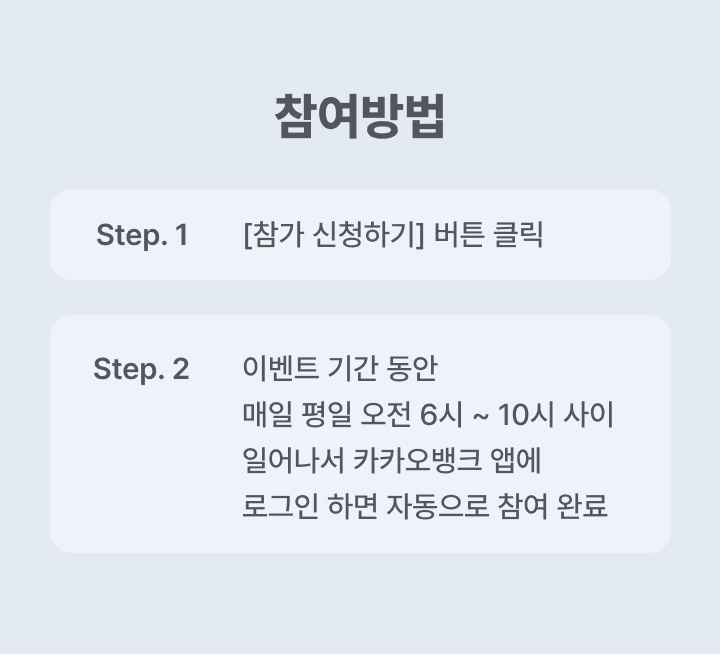 참여방법은 카카오뱅크 앱에 들어가면 배너들도 많지만 이벤트 페이지 안에 26일 굿모닝 챌린지를 누르시고 들어가서 [참가 신청하기] 버튼을 누르시면 됩니다.