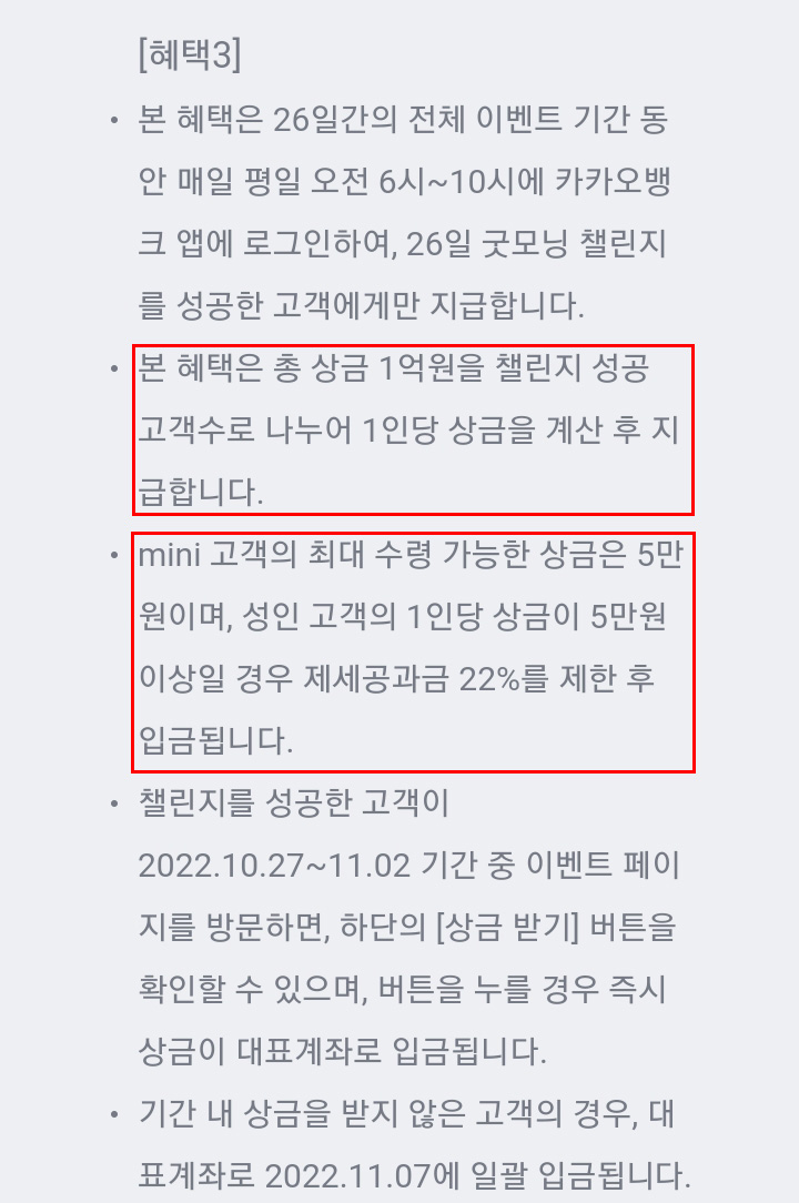 조금 특이한 방법인데 26일간 전체 챌린지에 성공한 고객의 수를 나누어서 1인당 상금을 계산 후에 지급합니다.