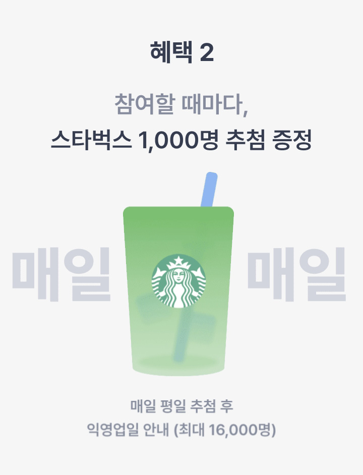 참여할 때마다, 스타벅스 1,000명을 추첨해서 증정합니다.
