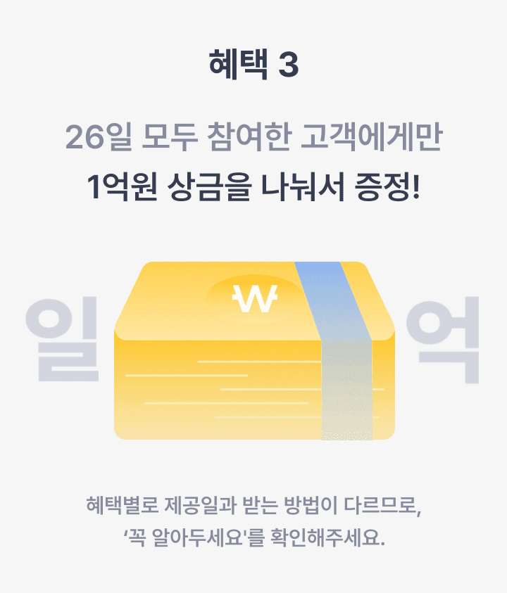 26일 모두 참여한 고객에게는 1억원 상금을 나눠서 증정합니다.