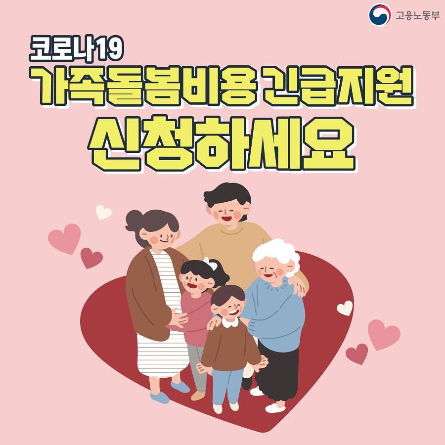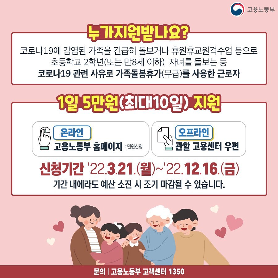 고용노동부에서 2022년 3월 21일부터 '코로나19 가족돌봄비용 긴급지원 사업'의 신청 및 접수를 시작한다고 해요.