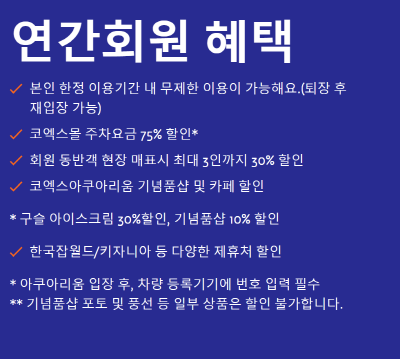 코엑스 아쿠아리움의 연간 회원권을 구입하면 1년 동안 언제든지 아쿠아리움을 방문할 수 있습니다.
