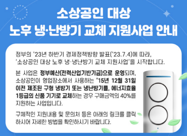 지원금도 받고 냉난방기를 새로운 것으로 교체도 할 수 있으니 소상공인분들은 이번 기회를 놓치지마세요.