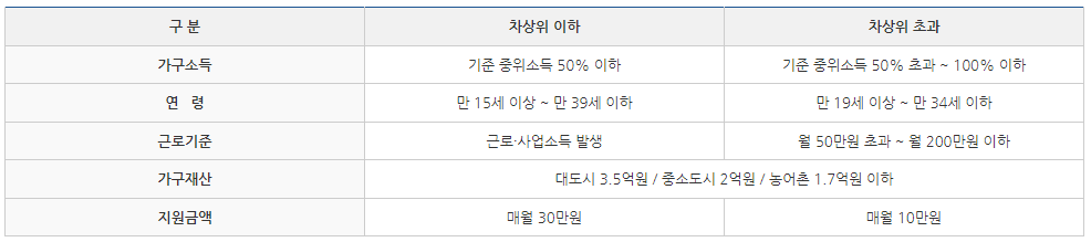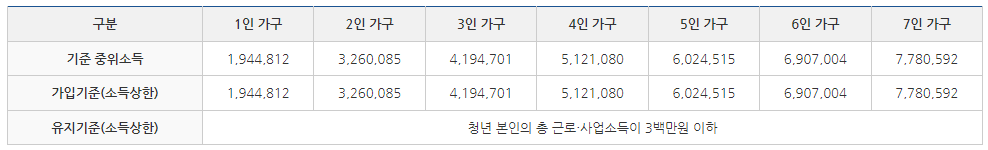- 유지기준은 청년 본인의 총 근로·사업소득이 매달 3백만원 이하로 소득상한이 유지되어야 합니다.