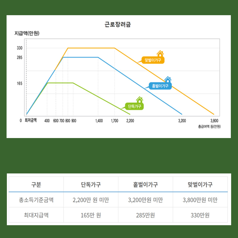 - 홑벌이 가구 (3,200만 원 미만 / 최대 285만 원)