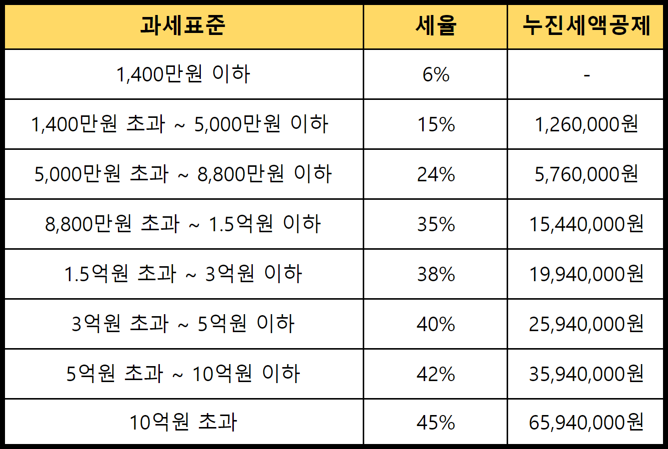 | 세율 적용 : 과세표준 X 해당세율 - 누진공제액 = 산출세액 |