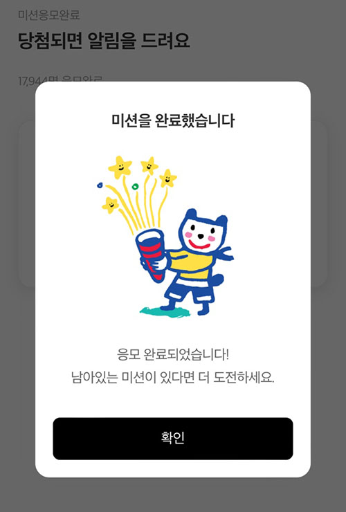 하단에 응모하기 버튼 클릭 후 간단한 과정으로 참여 완료가 됩니다. 당첨되길 기다려 볼게요~