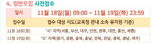 | 일반모집 사전 접수일 | 접수 대상 시도 (교육청 관내 소속 유치원 기준) |