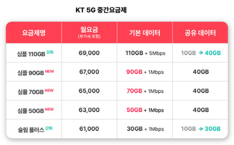5G 심플 요금제는 2개였던 KT의 중간요금제가 3개가 추가되었습니다.
