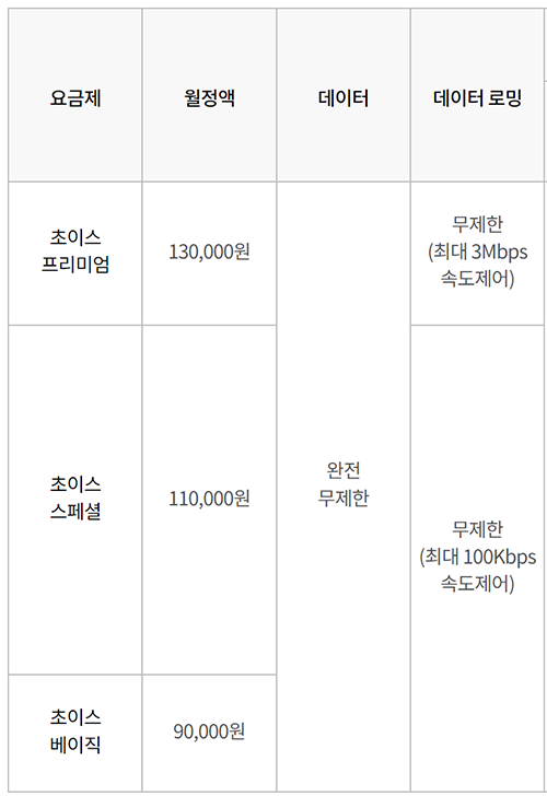 데이터 완전 무제한 요금제는 5G 초이스 요금제입니다.