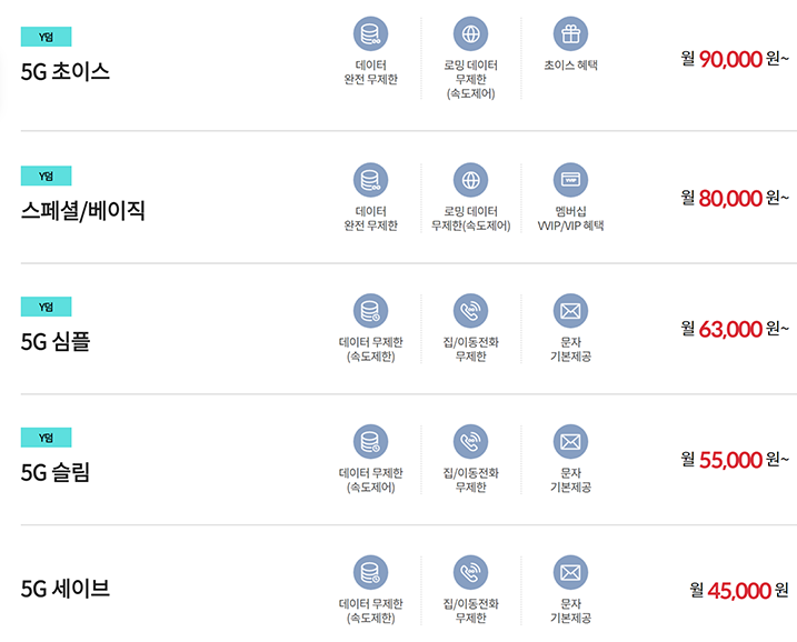 5G의 중간 요금제도 추가 되고 청년 요금제가 새롭게 생겼습니다.
