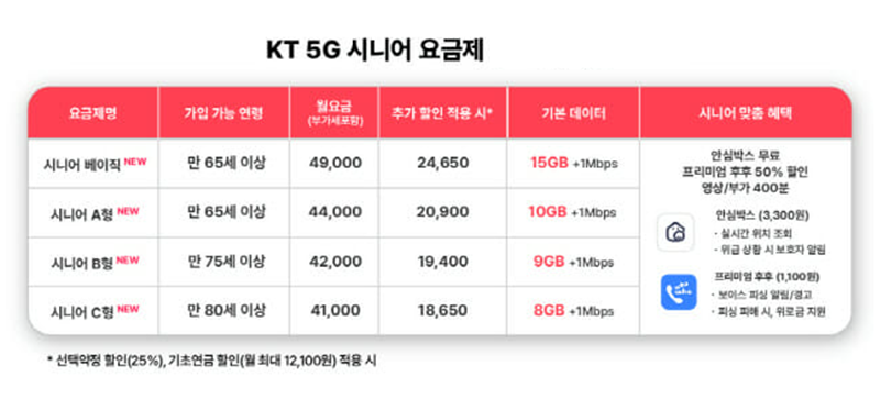KT는 시니어 가입자와 가족을 위한 안심서비스를 5G 시니어 요금제에 기본으로 제공하는데 시니어 고객의 실시간 위치정보 공유, 위급상황 시 가족 알림 기능이 있는 KT 안심박스(월 3천300원)를 무료 제공합니다.