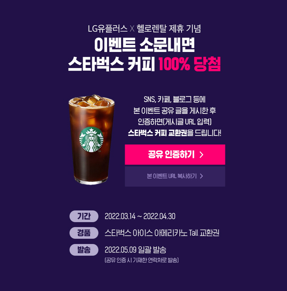 LG 유플러스 X 헬로렌탈 이벤트 소문 내면 스타벅스 커피 100% 당첨
