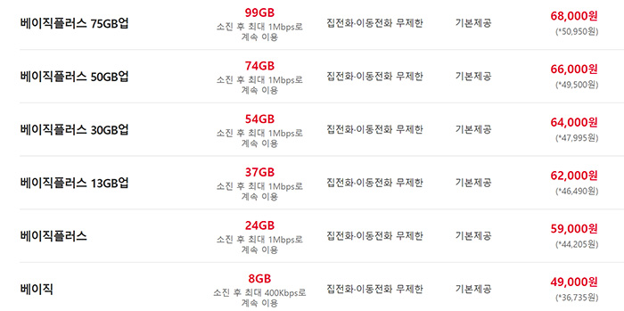 그런데 제일 용량 많이 주는 베이직플러스 75GB 업은 99GB에 68,000원입니다.
