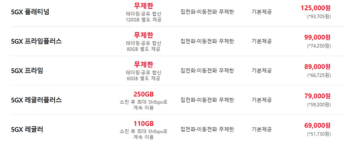 5GX는 플래티넘, 프라임플러스, 프라임, 레귤러플러스, 레귤러 이렇게 5개의 요금제가 있습니다.