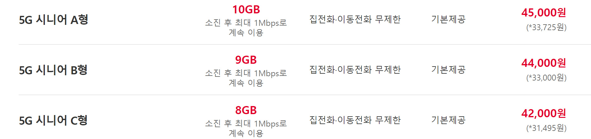 가격은 45,000원 44,000원 42,000원인데 시니어 요금의 경우 65세 이상 가입할 수 있습니다.